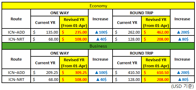 [에티오피아항공] YR 변동 예정 안내 (4월 1일 부 인상)2026-03-30 11:20:02.0